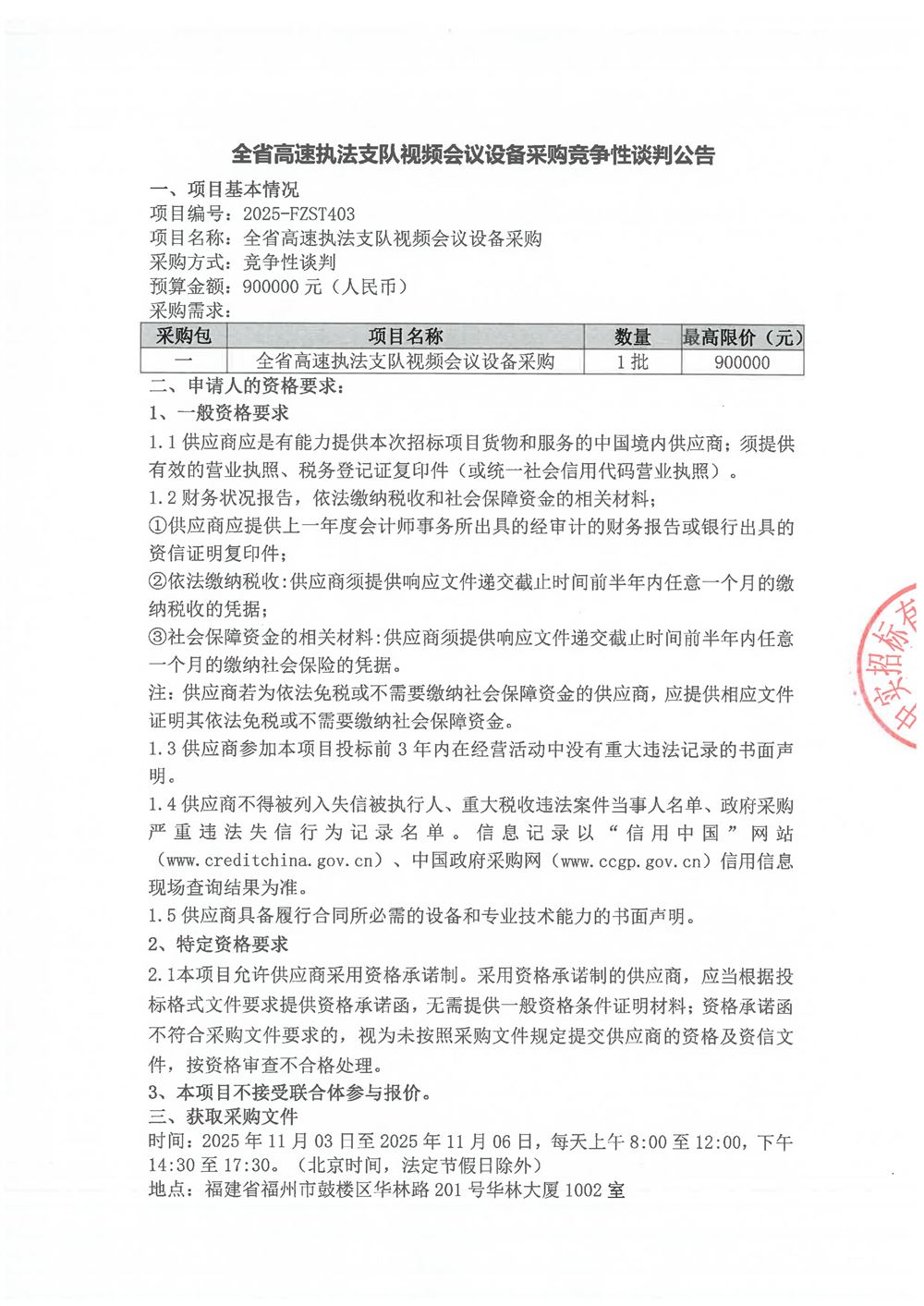 全省高速执法支队视频会议设备采购竞争性谈判公告
