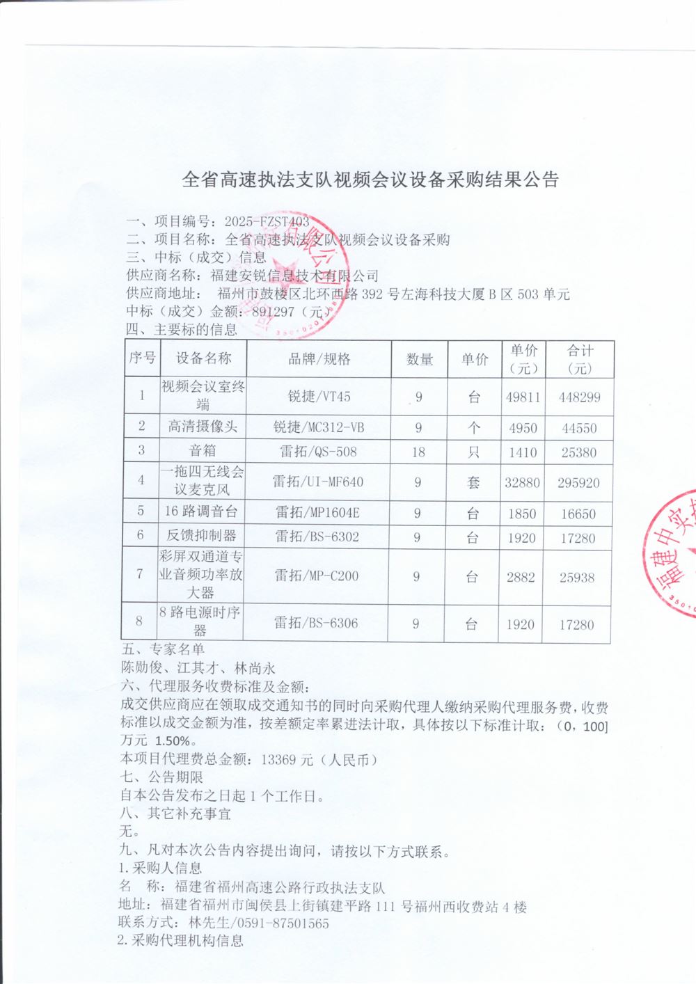 全省高速执法支队视频会议设备采购结果公告